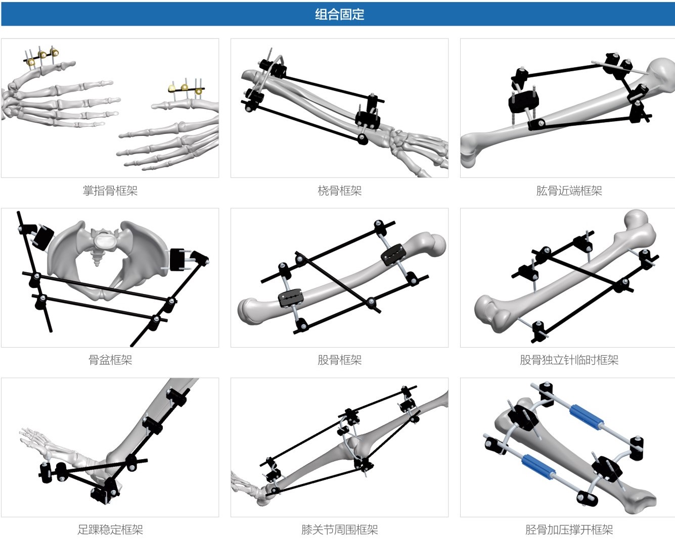 骨科用外固定支架目前已經廣泛應用于各種肢體骨折的治療,如:肱骨、脛骨、股骨、橈骨、手足部骨折、骨盆骨折等。它具備穿針方便、創傷小、對骨的血供破壞較少、固定范圍靈活等多種優點,對于開發性骨折、多發性創傷、關節骨折、兒童骨折等有良好效果。正確應用骨外固定支架治療骨折,不但能取得更高的療效,而且治療時間可縮短33~80%。因此,骨外固定技術不僅是骨科標準治療方法之一,而且在某些方面還占有主導地位,已成為治療復雜骨折最有把握的方法之一。