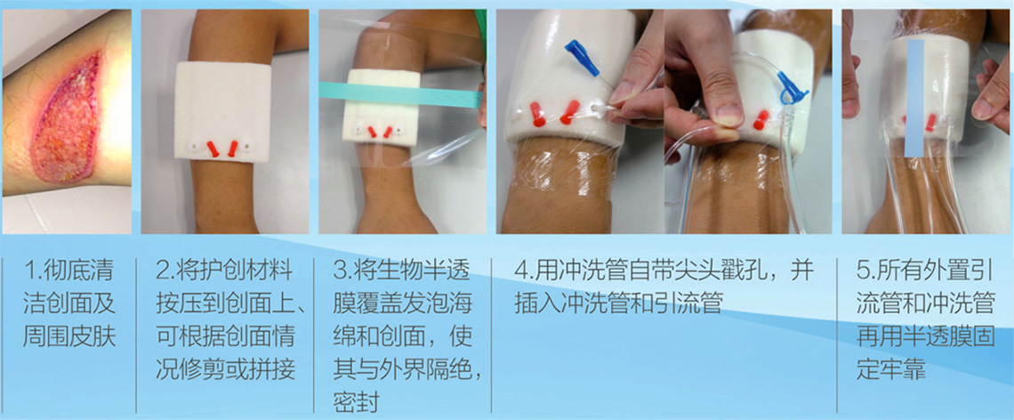 3、 采用醫(yī)用生物半透薄膜覆蓋發(fā)泡海綿和創(chuàng)積,使其與外界隔離、封閉;